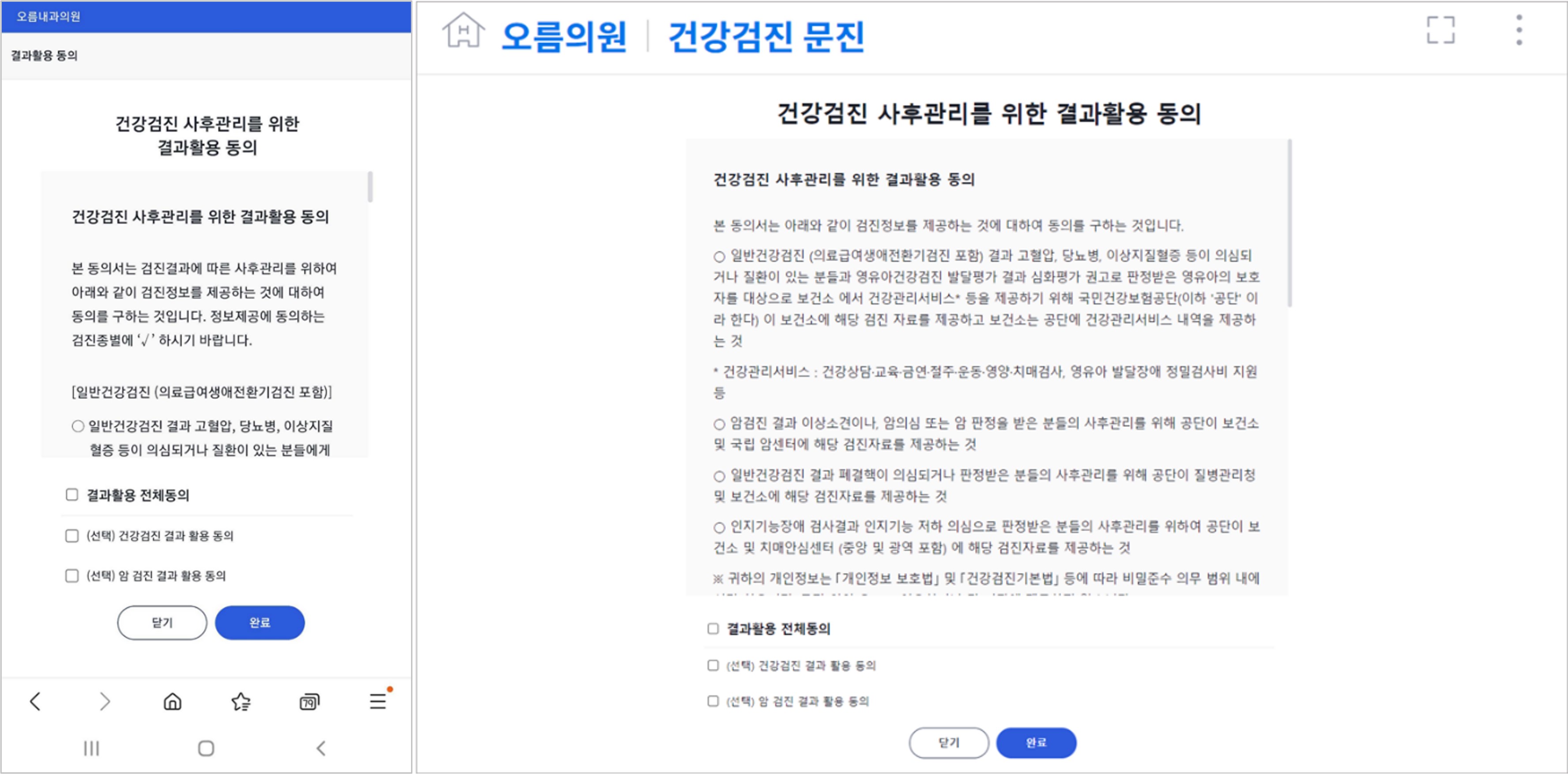 최근, 그동안 종이로만 가능했던 '건강검진 사후관리를 위한 결과활용 동의서'를 모바일, 태블릿 문진표를 통해 받으며, 서명은 방문 시 서명패드(싸인패드)로 받아 차트와 연동하는 기능이 더해졌는데요. 동의서를 파일 형태로 생성하여 이를 공단 관할 지사에 제출만 하면 되기에 병원은 한결 편리해졌죠. 병원 업무의 효율 향상을 위해 지속 개선하는 오름차트의 방향성을 보여준 업데이트입니다.