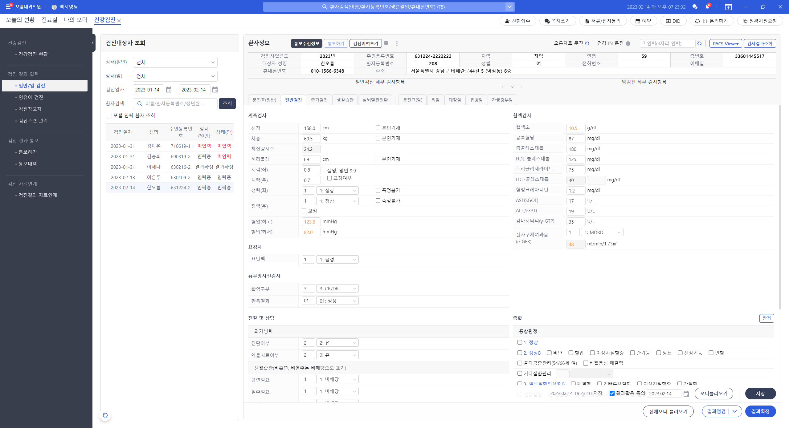 - 결과 입력 - 관찰 소견 및 판정 소견을 진료실 화면에서 바로 입력할 수 있으며, 그 외 검사 결과는 각 지원부서 담당자가 입력합니다.