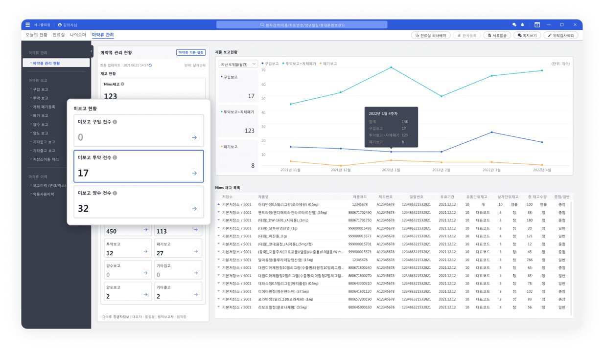 국가공단검진을 시행하는 의료기관에서 마약과 향정 약제 원내 취급 시 마약류 관리는 필수입니다. 오름차트에서는 마약류통합관리시스템(NIMS) 연동 기능을 제공하여 마약류 구입, 투약, 폐기, 양도/양수, 자장소 이동 보고가 편리합니다. 또한, 전자서명 기능도 지원되어 불필요한 페이퍼 작업에서 한결 자유로워지게 됩니다.