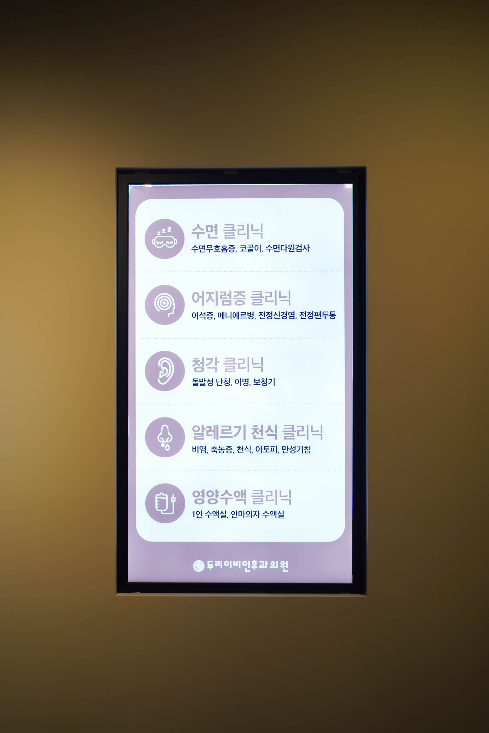 - 진료 과목 : 감기, 비염, 청각, 어지럼증, 축농증, 천식, 수면, 영양수액 등